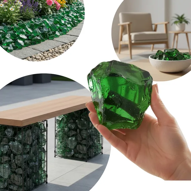 ✅Dualizm kolorystyczny: W stanie suchym bryły mogą posiadać biały nalot produkcyjny, który nadaje im lekko matowy charakter. Po spłukaniu wodą lub w czasie opadów szkło odsłania swoją właściwą barwę – głęboką, butelkową zieleń. Woda wydobywa prawdziwe oblicze Zielonych Brył Szklanych, podkreślając ich przejrzystość, połysk i naturalne refleksy świetlne.