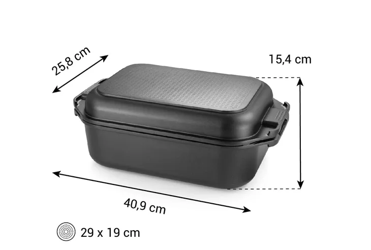 Solidna brytfanna wyposażona w dno indukcyjne w naczyniu i pokrywie, wysokiej jakości powłokę antyadhezyjną, wygodne uchwyty i wytrzymałe wykończenie wewnątrz naczynia. Pokrywa służy także jak oddzielne naczynie do pieczenia. Odpowiednia do użytkowania we wszystkich rodzajach piekarników oraz na wszystkich typach kuchenek włącznie z indukcją. Brytfanna została wykonana z odlewu aluminium oraz wysokiej jakości stali nierdzewnej, można ją myć w zmywarce.