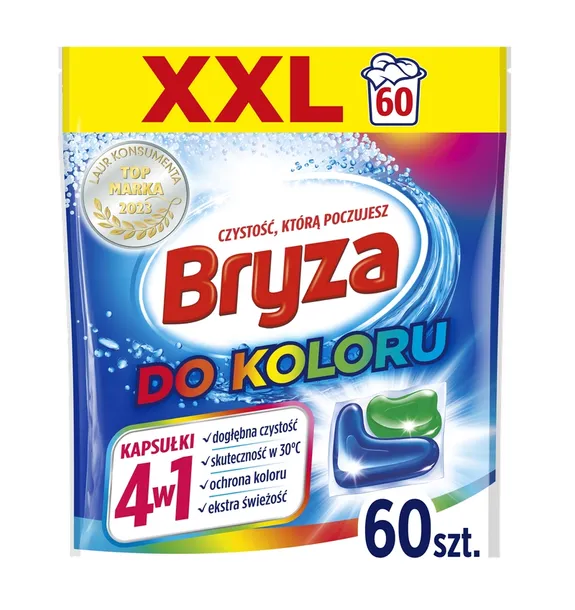 Bryza 4w1 to aż 60 kapsułek, dzięki którym Twoje pranie będzie cieszyć czystością i świeżym zapachem jeszcze dłużej. Nowe, jeszcze większe i wygodniejsze opakowanie kapsułek Bryza, pozwoli Ci zrobić aż 20% prań więcej*.Czystość, którą poczujesz już po pierwszym stosowaniu!Kapsułki są łatwe w użyciu i działają nawet w niskiej temperaturze. Czas na zmianę w Twoim podejściu do prania -poczuj komfort i prostotę, oraz ciesz się praniem czystym i pachnącym, jak nigdy dotąd.Zaufaj sile kapsułek Bryza i zobacz różnicę już po pierwszym praniu.*Względem Bryzy 4w1 50 kapsułek."Skoncentrowany środek w kapsułkach do prania kolorowych tkanin zapewnia upragnioną świeżość i czystość Twoich ubrań.Bryza 4w1 do koloru to kapsułki stworzone do prania i ochrony kolorów Twoich ubrań. Nadają Twojemu praniu idealną czystość, którą nie tylko zobaczysz, ale i poczujesz. Sprawdź i poczuj super świeżość po 1 praniu.; Uwaga. Działa drażniąco na oczy. Działa drażniąco na skórę. Działa szkodliwie na organizmy wodne, powodując długotrwałe skutki. CHRONIĆ PRZED DZIEĆMI. Przechowywać wyłącznie w oryginalnym opakowaniu. Dokładnie umyć ręce po użyciu. W PRZYPADKU DOSTANIA SIĘ DO OCZU: Ostrożnie płukać wodą przez kilka minut. Wyjąć soczewki kontaktowe, jeżeli są i można je łatwo usunąć. Nadal płukać. W przypadku utrzymywania się działania drażniącego na oczy: Zasięgnąć porady/zgłosić się pod opiekę lekarza. W PRZYPADKU POŁKNIĘCIA: Natychmiast skontaktować się z OŚRODKIEM ZATRUĆ/lekarzem. NIE wywoływać wymiotów. Zawartość/pojemnik usuwać do odpowiednio oznakowanych kontenerów zgodnie z lokalnymi, regionalnymi, krajowymi i międzynarodowymi przepisami. Nie przekłuwać, nie rozrywać, nie przecinać. Jeśli dziecko włoży kapsułkę do ust, natychmiast ją usunąć i nie wywoływać wymiotów. Używać wyłącznie suchymi rękami.POŁKNIĘCIA: Natychmiast skontaktować się z OŚRODKIEM ZATRUĆ/lekarzem. NIE wywoływać wymiotów. Zawartość/pojemnik usuwać do odpowiednio oznakowanych kontenerów zgodnie z lokalnymi, regionalnymi, krajowymi i międzynarodowymi przepisami. Nie przekłuwać, nie rozrywać, nie przecinać. Jeśli dziecko włoży kapsułkę do ust, natychmiast ją usunąć i nie wywoływać wymiotów. Używać wyłącznie suchymi rękami. UFI: MJE5-G0JM-K002-ASGV