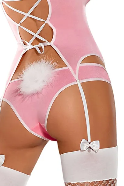Bazę kostiumu stanowi różowy gorset bez fiszbin ze sznurowaniem pozwalającym dopasowanie go do sylwetki. Szereg kokardek wraz z pionowym rozcięciem pośrodku optycznie wysmukla sylwetkę. Jego ramiączka tak samo jak paski do pończoch posiadają regulację. Komplet Obsessive Bunny nie byłby pełen bez króliczych uszu oraz uroczych, różowych szortów ozdobionych puszystym ogonkiem. Dodatkowo zestaw zawiera parę elastycznych, białych kabaretek. W składzie materiału znajdziemy gorset, majtki, uszy: 88% poliester, 12% elastan; pończochy: 80% nylon, 20% elastan.