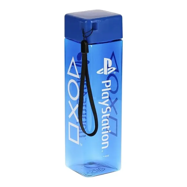 Niebieska, kwadratowa plastikowa butelka o pojemności 500 ml ozdobiona ikonami i logo kontrolera PlayStation. Butelka jest wyposażona w pasek na nadgarstek, dzięki czemu można ją łatwo nosić przy sobie. Kwadratowy kształt ułatwia przechowywanie w torbie lub na drzwiach lodówki. Nie nadaje się do mycia w zmywarce ani używania w kuchence mikrofalowej.Specyfikacja produktu: