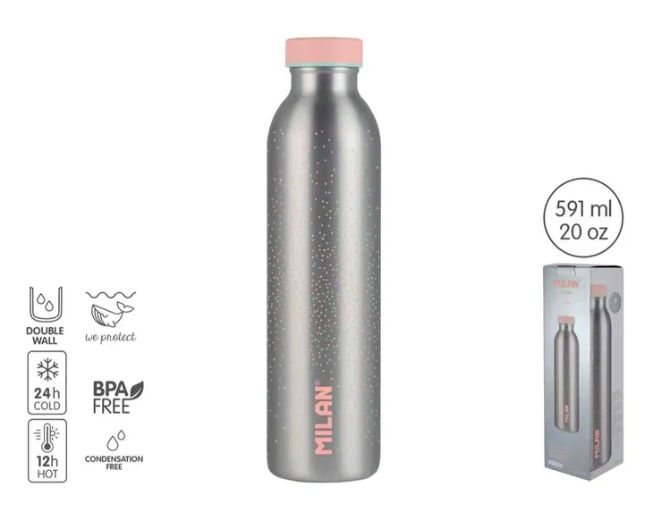 Butelka termiczna z kolekcji SILVER, duża w kolorze srebrnym z różową zakrętką. Wykonana ze stali nierdzewnej. Posiada hermetyczną zakrętkę z uszczelką polipropylenową dla maksymalnej szczelności. Dwuwarstwowa izolacja próżniowa pozwala utrzymać temperaturę wewnątrz do 12 godzin dla płynów gorących i 24 godziny dla płynów zimnych. Zapobiega także kondensacji na zewnętrznej powierzchni, dzięki czemu butelka nie poci się w dłoni lub torbie i zawsze pozostaje w temperaturze pokojowej. Może służyć jako termos na gorące napoje. BPA Free: zachowuje smak i świeżość wody. Pamiętaj!!! Stosowanie butelek wielokrotnego użytku przyczynia się do zmniejszenia zużycia plastikowych butelek jednorazowego użytku. Pojemność: 591 ml. Wysokość 26,2 cm. Średnica: 6,85 cm. Waga: 0,27 kg.