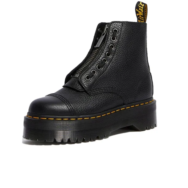 Damskie buty na platformie marki Dr. Martens - wykonane z certyfikowanej miękkiej, skóry naturalnej - Leather Working Group (Złoto), pochodzącej z ekologicznych garbarni. Ciekawa odsłona klasycznego ośmiodziurkowego modelu wzbogacona o zamek błyskawiczny na języku. Model w czarenj wersji kolorystycznej z charakterystycznymi, żółtymi przeszyciami. Gumowa, elastyczna odporna na ścieranie podeszwa, doszyta do wierzchu buta przy wykorzystaniu technologii Goodyear oraz kultowa, typowa dla martensów poduszka powietrzna umieszczona tuż pod tekstylną wyściółką zapewniają doskonałą amortyzację drgań. Dzięki uniwersalnemu designowi, Martensy znakomicie sprawdzają się w naprawdę różnorodnych stylizacjach!