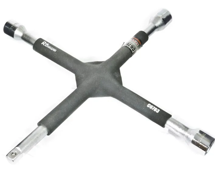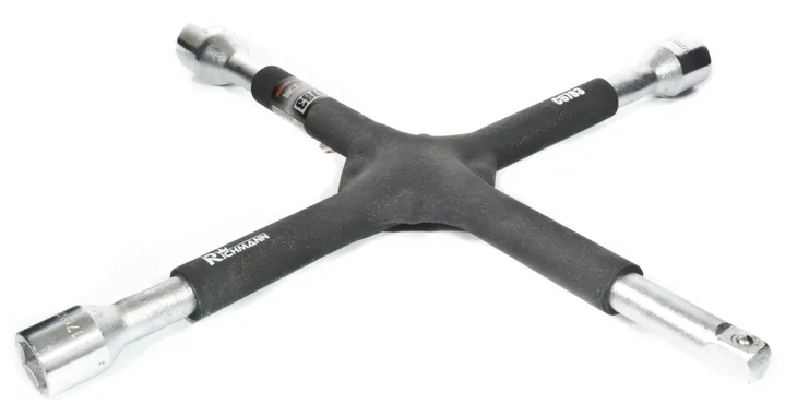 - Posiada 4 ramiona z nasadkami dostosowanymi do wszystkich sześciokątnych, metrycznych rodzajów śrub i nakrętek stosowanych w samochodach osobowych i lekkich dostawczych.