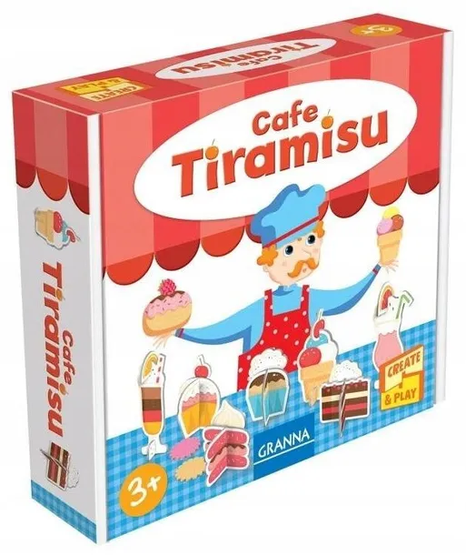 Zestaw kreatywny - złóż i baw się! Marzysz o prowadzeniu własnej cukierni? Z zestawem Cafe Tiramisu możesz stworzyć przytulne miejsce, które przyciągnie klientów wyjątkowymi deserami! Stwórz swoje stoisko z pudełka, zaprojektuj oryginalne menu i serwuj słodkie specjały wszystko, co tylko podpowie Ci wyobraźnia. W zestawie znajdziesz tekturowe elementy do złożenia deserów, naklejki do dekoracji stoiska oraz tekturowe pieniądze, które pozwolą Ci wcielić się w rolę właściciela cukierni. Puść wodze fantazji i twórz własne scenariusze zabawy, rozwijając kreatywność i wyobraźnię. Idealna zabawa dla małych twórców od 3. roku życia!