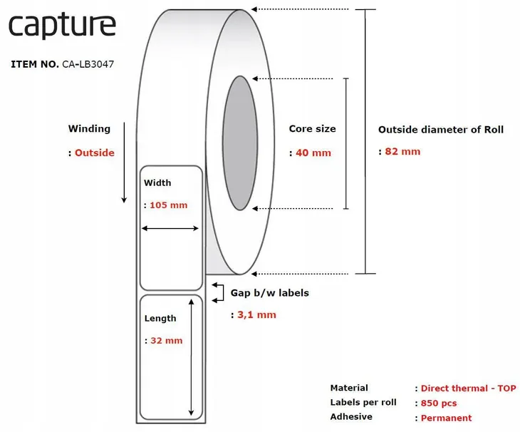 Capture Label 105x32, Core 40, Diam 82 mm. Thermal print. Top coated. Permanent. 850 labels per roll. 28 rolls per box.