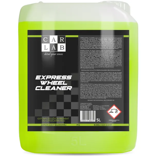 EXPRESS WHEEL CLEANER to gotowy do użycia, skuteczny i bezpieczny preparat o neutralnym pH przeznaczony do czyszczenia każdego rodzaju felg samochodowych, zwłaszcza aluminiowych. Zawiera specjalną kompozycję środków powierzchniowo czynnych, które szybko zwilżają, rozpuszczają brud i oddzielają go od powierzchni felg. Jest idealny zarówno do dogłębnego czyszczenia mocno zabrudzonych felg, jak i do ich regularnej pielęgnacji. Dzięki obfitej pianie, doskonale sprawdza się także przy bieżącym myciu opon. EXPRESS WHEEL CLEANER zawiera inhibitory korozji i nie zawiera wodorotlenków, zapewniając bezpieczeństwo dla felg.
