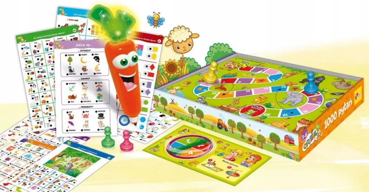 Carotina 1000 pytań proponuje kompletny program nauczania progresywnego za pośrednictwem bogato ilustrowanych, interaktywnych kart dydaktycznych. Dodatkowo opakowanie zawiera zabawną grę planszową w postaci quizów stworzoną z myślą o najmłodszych dzieciach.Z zestawem dziecko nauczy się wielu ciekawych rzeczy - alfabetu, słów, logiki, cyfr, kształtów, kolorów i zwierząt. 1000 pytań to mnóstwo zadań logicznych, których celem jest rozwijanie i utrwalanie umiejętności porównywania, kojarzenia, klasyfikacji oraz rozwijanie zmysłu obserwacji. Mówiąca i świecąca Magiczna Carotina będzie przewodnikiem po zadaniach - gdy dziecko prawidłowo odpowie, wyda radosne okrzyki i zaświeci, a jeśli udzieli niepoprawnej odpowiedzi, marchewka zmotywuje je do dalszych prób smutnym westchnięciem. Dzięki mówiącej Carotinie, która sygnalizuje odpowiedzi przedszkolak może bawić i uczyć się sam, bez pomocy osoby dorosłej.Z tym zabawnym quizem z wieloma grami edukacyjnymi nauka stanie się prawdziwą radością. Wesoły zestaw dostosowany do możliwości dzieci w wieku od 3 do 5 lat sprzyja rozwojowi podstawowych kompetencji i licznych umiejętności nabywanych w okresie przedszkolnym. Wzbudza u najmłodszych ciekawość do otaczającego świata oraz pokazuje im, jaka przyjemność może płynąć z jego odkrywania.