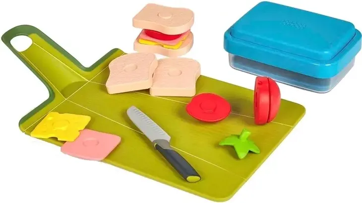 Produkt wykonano z trwałych tworzyw sztucznych, a wszystkie elementy są dostosowane do małych dłoni. W komplecie znajduje się składana deska do krojenia, bezpieczny nożyk, pudełko lunchowe oraz akcesoria imitujące chleb, ser, szynkę i pomidora. Zabawka przeznaczona jest dla dzieci od 2. roku życia.