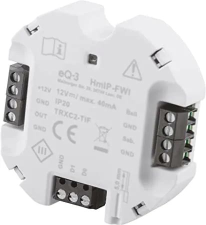 - Interfejs umożliwia integrację urządzeń obsługujących technologię Wiegand, takich jak zamki kodowe, czujniki linii papilarnych lub czytniki kart/transponderów z systemem Homematic IP Smart Home