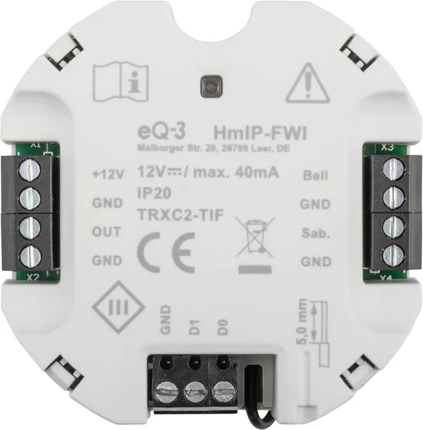 - Interfejs umożliwia integrację urządzeń obsługujących technologię Wiegand, takich jak zamki kodowe, czujniki linii papilarnych lub czytniki kart/transponderów z systemem Homematic IP Smart Home