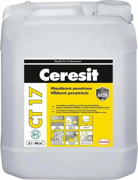 Preparat Ceresit CT 17 przeznaczony jest do gruntowania podłoży wewnątrz i na zewnątrz budynków przed montowaniem płytek ceramicznych, mocowaniem wykładzin podłogowych, wylewaniem posadzek, tapetowaniem, szpachlowaniem, malowaniem czy mocowaniem styropianu. Zagruntowane podłoża mają mniejszą nasiąkliwość, co zapobiega zbyt szybkiemu wysychaniu zapraw klejących, posadzek czy farb.