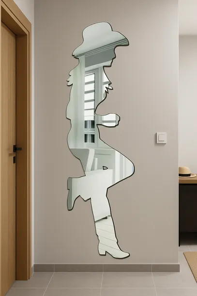 Chapeau Muse to designerskie lustro akrylowe w eleganckim konturze kobiety w kapeluszu — połączenie sztuki użytkowej i bezpiecznej formy dekoracyjnej, idealne do salonu, garderoby lub pokoju.