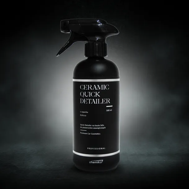 CHEMIKA Ceramic Quick Detailer to gotowy do użycia płyn oparty na SiO₂, który służy do pielęgnacji miejsc zewnętrznych, nawet tych niezabezpieczonych. Produkt pozostawia efekt hydrofobowy i śliskość, redukując ilość zabrudzeń przywierających do lakieru.