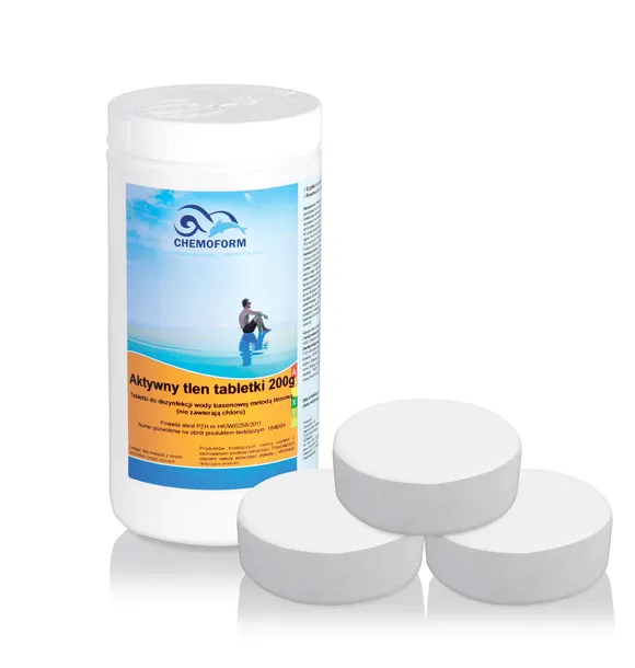 Szybko rozpuszczające się tabletki bakteriobójcze i grzybobójcze do dezynfekcji wody metodą tlenową w basenach kąpielowych. Preparat działa bardzo podobnie do środków chlorowych. Zaletą tego preparatu jest brak charakterystycznego, dość ostrego chlorowego zapachu wody oraz możliwość kąpieli w basenie osób, które są uczulone na chlor. Aktywny tlen jest najlepszą alternatywą dla tradycyjnych metod chlorowych. Zapewnia natychmiastową dezynfekcje wody basenowej metodą tlenową. Zwalcza bakterie, wirusy oraz inne nieczystości znajdujące się w wodzie basenowej. Aktywny tlen jest bezwonny, a jego łagodne działanie minimalizuje ryzyko podrażnienia skóry podczas kąpieli w basenie. Dodatkowo środek nie pieni się, poprawia klarownośc wody i jest o neutralnym pH. Szczególnie polecany, gdy z basenu korzystają dzieci. Do prawidłowego funkcjonowania zaleca się połączyć jego działanie z preparatem wspomagającym: Chemoform Aquablanc A (efekt synergii). Pierwsze dozowanie: 2 tabletki aktywnego tlenu i 800ml Chemoform Aquablanc A na każde 30m³ wody. Dozowanie uzupełniające: 1 tabletka aktywnego tlenu na 30m³ wody. Z uwagi na wysoką zawartość tlenu zalecamy szczególną ostrożność przy dozowaniu oraz zawsze zakładać rękawiczki. Dozowanie powinno się przeprowadzać wieczorem. Wszelkie informacje oraz szczegółowy sposób użycia i dozowanie znajdziesz na opakowaniu.