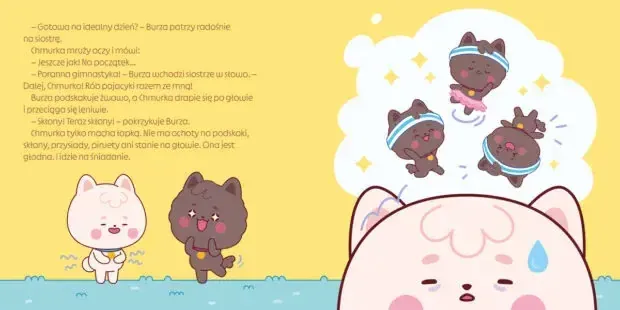 Chmurka i Burza – małe pieski, wielkie przygody! Chmurka jest pełna pomysłów, spontaniczna i wierzy, że wszystko jest możliwe. Spokojna Burza lubi planować i działa z uwagą – krok po kroku. Choć tak wiele je róźni, każdego dnia uczą się, jak być razem. Bo nie ma nic lepszego niż wspólna zabawa! Seria książeczek o Chmurce i Burzy przedstawia uwielbiane przez dzieci bohaterki animacji w nowej odsłonie. Co za wspaniały poranek i jaka świetna okazja do zabawy! Chmurka marzy o spokojnym początku dnia, ale Burza nie może usiedzieć w miejscu. Ma tyle pomysłów! Czy pieski znajdą zabawę, która będzie podobała się im obu? A może lepiej spędzić czas osobno? Na szczęście Chmurka i Burza, choć są różne, zawsze potrafią się dogadać.