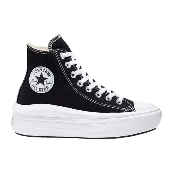Trampki damskie na wysokiej platformie z wysoką cholewką z linii All Star znanej na całym świecie marki Converse wykonane z czarnej tkaniny. Wnętrze butów oraz wkładka również uszyte są ztkaniny. Okrągły kształt czubka zapewnia dużo miejsca na palce stóp. Sznurowadła czynią obuwie łatwe w zakładaniu i dostosowaniu do stopy. Płaska podeszwa typu platforma wykonana z wysokiej jakości tworzywa ma wysokość 5 cm. Jest charakterystyczna dla tego typu obuwia sportowego. Trampki są lekkie i praktyczne, dzięki czemu stanowią doskonałe uzupełnienie każdego sportowego lub casualowego stroju.