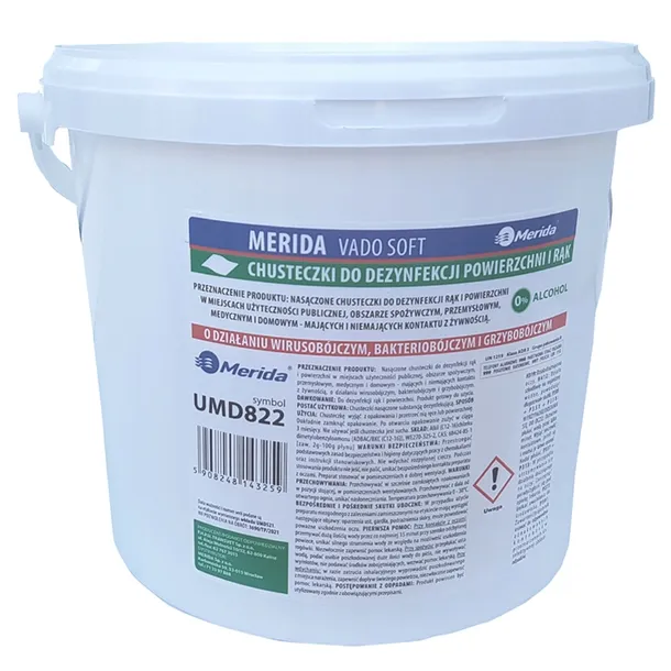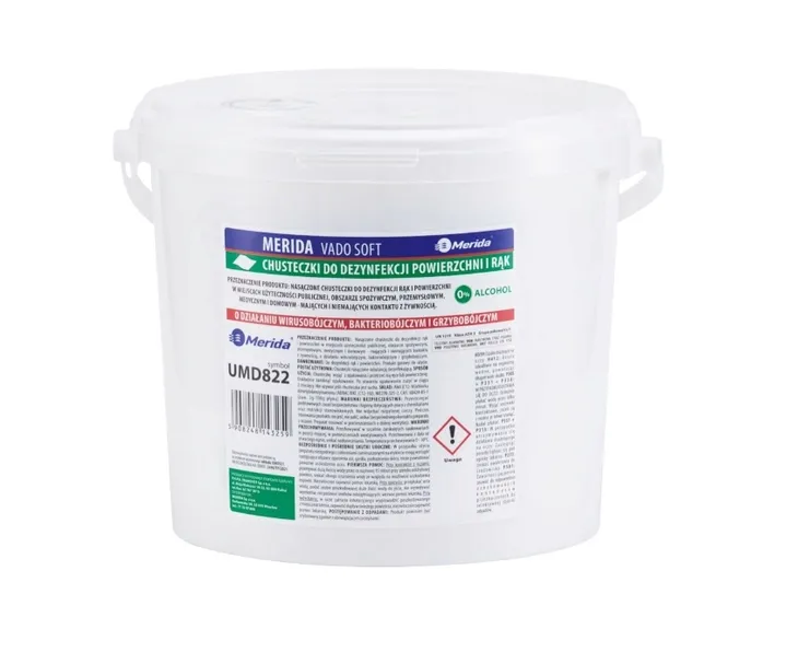 Chusteczki nasączone do dezynfekcji rąk i powierzchni MERIDA VADO SOFT, bezalkoholowe, wiadro 6 l, rolka 65 m, 260 listków
