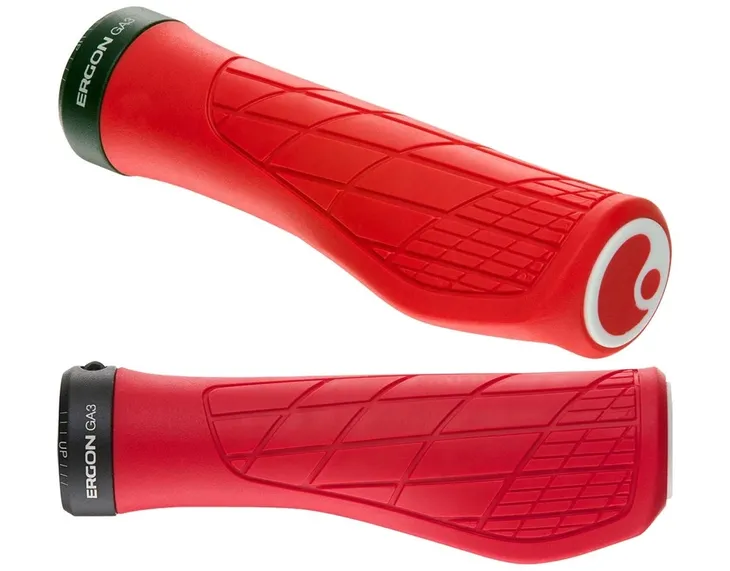 Nowe, komfortowe chwyty all-mountain. Koncepcja łączy zalety podcięcia płaszczyzny skrzydełka i ergonomicznego wspierania nadgarstka przez uchwyt ze swobodą ruchów na kierownicach MTB. GA3 to ergonomiczny kształt, tekstury przystosowane do chwytania w zwężającej się strefie i grubość ścianki rdzenia wewnętrznego, która ma na celu zwiększenie efektu amortyzującego. Chwyty swą doskonałą przyczepność zawdzięczają super miękkiej, odpornej na promieniowanie UV mieszance gumy opracowanej w Niemczech wyłącznie dla Ergona. To sprawia, że masz dzięki temu najlepszą kontrolę na szlaku. Wewnętrzne aluminiowe zaciski oferują dużo przestrzeni, nawet dla osób z dużymi dłońmi. Wymienne zaciski na kierownicach z włókna węglowego mają maksymalną wytrzymałość na skręcanie.