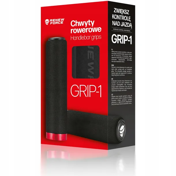 ✅RENEW FORCE Kolor: Czarno-czerwony Materiał: Miękka gąbka o dużej gęstości + plastik Materiał pierścienia: Strop aluminium Wymiary zewnętrzne: 130x35 mm Średnica kierownicy: 22,2 mm Redukcja wibracji Ilość w zestawie: 2 sztuki