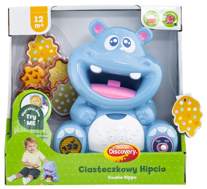 "Głodny""Ciasteczkowy Hipcio"" czeka aż go nakarmisz! Interaktywna zabawka wspaniałe łączy naukę z zabawą.Kiedy dziecko kończy pierwszy rok życia następuje wielki przełom w jego życiu, zaczyna odbierać coraz więcej bodźców, jest bardziej ciekawe otaczającego go świata. Zdolność przemieszczania się daje mu możliwość odkrywania świata. To doskonały moment na wymianę grzechotek niemowlęc""Ciasteczkowy Hipcio"" jest jedną z nich. Dzięki niej Twoje dziecko szybko nauczy się liczyć do 10. Aby ją uruchomić należy wcisnąć przycisk z liczbami na prawej łapce, zabawka rozbłyśnie kolorowymi światełkami i wesołą melodią.Do nakarmienia naszego Hipcia posłużą dołączone ciasteczka, które po włożeniu do buźki wpadają do brzuszka rozpoczynając liczenie. Po wyjęciu ciasteczek z brzuszka rozpoczynamy zabawę od nowa. Hipcio mówi w dwóch językach: polskim i angielskim. Odpowiadający język wybieramy przyciskiem znajdującym się na lewej łapce. W zestawie znajduje się 5 ciasteczek. Zabawka przeznaczona dla dzieci powyżej 12 miesiąca życia.Zabawki firmy Dumel Discovery wpływają na prawidłowy rozwój poznawczy, motoryczny oraz muzyczny naszych dzieci. Celem jest edukacja i rozwój dzieci we wczesnych etapach życia. Firma gwarantuje wysoką jakość oferowanych produktów oraz zgodność z "
