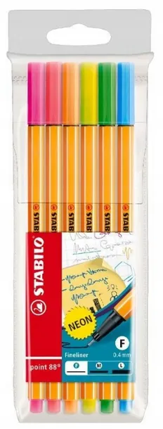 Niezaprzeczalny nr 1 wśród cienkopisów od 1977 r. W każdej sekundziesprzedają się 4 cienkopisy point 88 w cienkopis dopisania, podkreślania, kreślenia i kolorowania. Mocna, oprawiona w metalkońcówka jest odporna na złamania i rozwarstwienia, co gwarantuje wysoki komfortpisania aż do całkowitego wyczerpania tuszu. Grubość linii 0,4 mm. Wentylowanaskuwka umożliwia oddychanie w przypadku nagłego połknięcia. Jedyny cienkopisdostępny aż w 47 kolorach. Plastikowe etui z zawieszką zawierające 6 szt. wneonowych kolorach