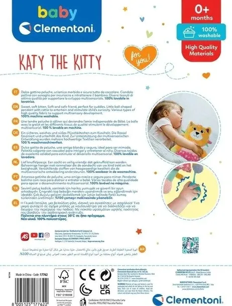 Słodka i żywa zabawka dla maluszka. Miła i bezpieczna pluszowa kicia, bardzo szybko stanie się nierozłączną przyjaciółką maluszka w pierwszych miesiącach życia. Ten mięciutki miś został wykonany z różnych materiałów o rozmaitych teksturach, aby pobudzić rozwój multisensoryczny dziecka. Szeleszczące uszy oraz mała zawieszka w kształcie kulki z grzechotką pobudzą ciekawość malucha.