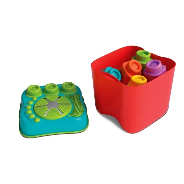 - 15 miękkich, kolorowych klocków o wymiarach około 5 × 5 × 5 cm, które można łączyć ze sobą lub wkładać do koszyka przez otwór w pokrywce.