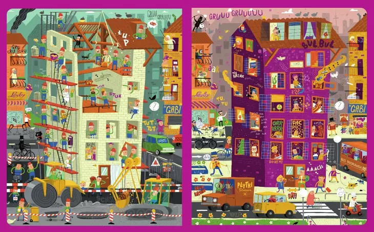 Wyjątkowa książka-wyszukiwanka o budowie z obrazkami „przed” i „po” . Do odkrywania, porównywania i wpadania w zachwyt. Na placu budowy jest wiele do odkrycia – są koparki i buldożery, można wiercić, kuć, murować, malować i kopać. W tej zabawnej książeczce dzieci mogą odkrywać tajniki różne place budowy - w mieście i na wsi, budowę ogromnego budynku mieszkalno-usługowego i budowę autostrady. Place budowy w porcie i na lotnisku. A gdy bóbr buduje dom... to też jest przecież budowa! A kiedy wszystko jest już gotowe? Wtedy można się tam wprowadzić, mieszkać, bawić się, i pracować! Pełna wyrazów dźwiękonaśladowczych książeczka uczy i bawi! Spróbujcie się nie śmiać, naśladując rozmaite odgłosy podczas czytania! Pełna szczegółów, kolorowa książka wspierająca naukę mówienia, nazywania i opowiadania, która rozwija spostrzegawczość. Wyrazy dźwiękonaśladowcze sprawiają, że nie tylko przyjemnie się ogląda, ale również słucha. Dzieci poznają nowe wyrazy i odgłosy, jakie wydają maszyny oraz zwierzęta. Znakomite połączenie nauki i zabawy.