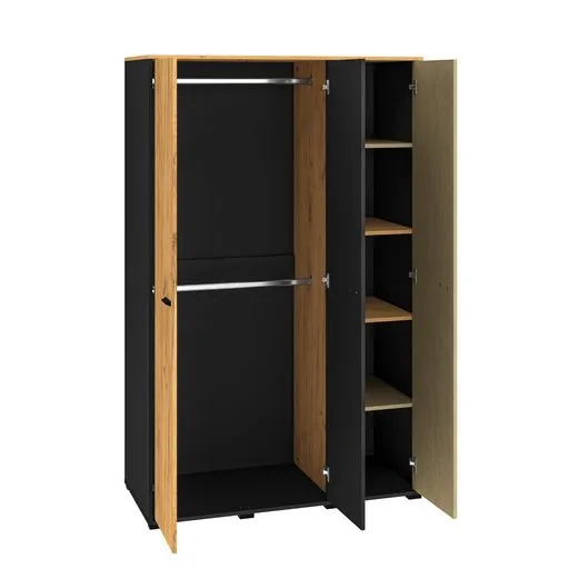 Szafa trzydrzwiowa: z lewej strony dwa drążki na ubrania, z prawej strony cztery półki