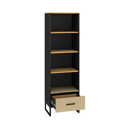 Regał z półkami i jedną szufladą.