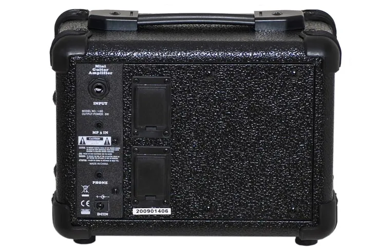 Na tylnej ściance znajdują się gniazdka oraz miejsce na bateria. Gniazdka są 4: zasilanie, gniazdo gitarowe jack 6,3, wejście mp3 jack 3,5, wyjście słuchawkowe jack 3,5.