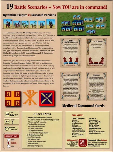 The medieval battles showcased in the scenario book focus on the historical confrontations between the Byzantine Empire and Sassanid Persians (530 to 627 AD) with a slight detour to battle the Moors and their rebel allies (645 - 648 AD). The Byzantine Empire during this period of medieval history was one of constant transition and reorganization. Its army tended to mirror its eastern adversaries by deploying an increasing number of armored cavalry formations (Cataphracts) and more missile troops. Yet, it was how the Byzantines adapted their battlefield tactics in relation to the enemy it faced that is perhaps the chief reason for the longevity of their Empire.