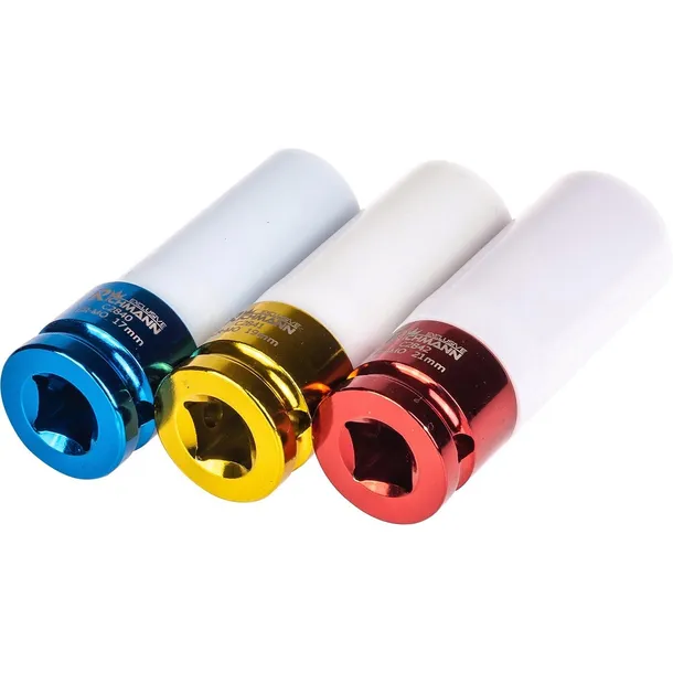 Zestaw 3 nasadek do felg aluminiowych 1/2". Wykonane ze stali chromowo-molibdenowej Cr-Mo. Posiadają tuleję zabezpieczającą z miękkiego tworzywa, która chroni felgę przed możliwością uszkodzenia powłoki lakierniczej. Każda z nasadek w innym kolorze dla ułatwienia użytkowania. Nasadki jakości premium. Zestaw umieszczony w dedykowanej kasecie z tworzywa sztucznego.