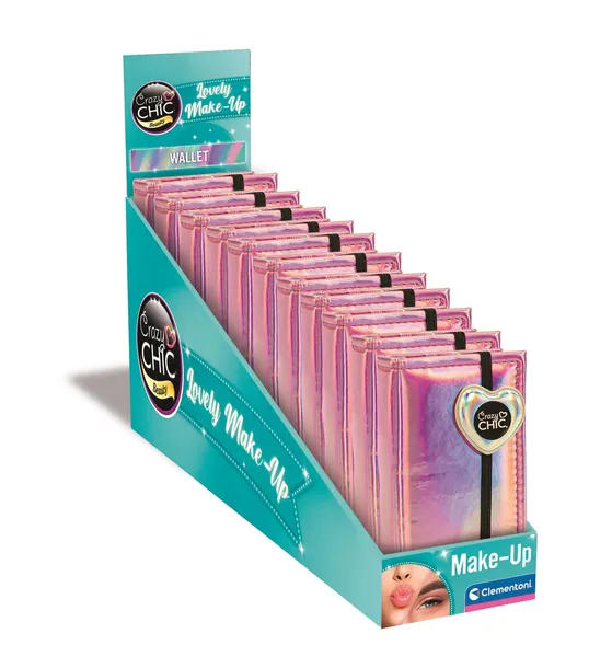 Miękka kosmetyczka z efektem holograficznym zamykana na gumkę. Zawartość: 12 cieni do powiek, 4 błyszczyki, 3 róże, dwa aplikatory i 1 lusterko Ekspozytor 11 szt.