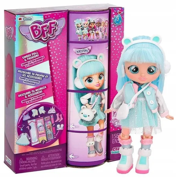 Kristal ma stylowe, niebieskie włosy upięte w wysoki kucyk i kryształowe oczka. Nosi modny strój - niebieską suknię z tiulową nakładką, metaliczną kurtkę, wysokie skarpetki i buty! Do tego torebka inspirowana niedźwiadkami polarnymi, urocze nauszniki w takim samym stylu oraz wyjątkowy naszyjnik BFF.