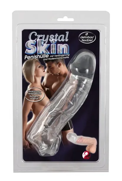 Ten przezroczysty rękaw na penisa z przedłużeniem i pierścieniem kulkowym marki Crystal Clear pogrubia penisa dzięki grubości materiału i wyraźnym żyłkom oraz wydłuża go o 5 cm dzięki masywnej żołędzi.
