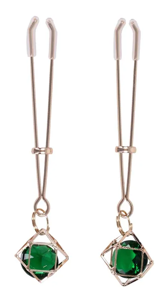 Odrobina drażnienia, subtelny nacisk i wyraźna dawka blasku. Klipsy na sutki Indica łączą w sobie regulowaną intensywność doznań z eleganckim, zmysłowym designem. Regulowana siła zacisku pozwala dopasować poziom nacisku do własnych preferencji, zapewniając pełną kontrolę nad doświadczeniem. Miękkie, gumowe końcówki zwiększają komfort i stabilność podczas noszenia. Wiszący zielony kryształ oraz złote detale nadają całości luksusowego charakteru, czyniąc je idealnym dodatkiem zarówno do gry wizualnej, jak i eksploracji wrażeń. To stylowy wybór dla osób rozpoczynających przygodę z zabawą sensoryczną, jak i dla tych, którzy cenią elegancką dominację z nutą glamour.