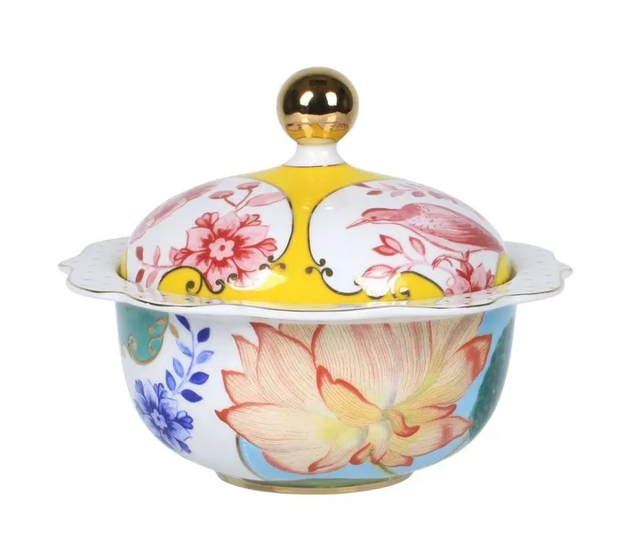 Marka PiP Studio stworzyła przepiękną i pełną kolorów kolekcję Royal Multi. Porcelana z kolekcji Royal Multi, wyróżnia się barwnym, kwiecistym wzorem oraz charakterystycznym dla marki złotym wykończeniem.Urocza cukiernica Royal Multi wykonana została z wysokiej jakości porcelany. Oryginalny kształt, intensywne barwy oraz ręcznie naniesiony, przepiękny dekor, nawiązujący do stylistyki japońskiej porcelany - to wszystko sprawia, że cukiernica wygląda bajecznie i zdecydowanie przyciąga swoją uwagę.Pojemność cukiernicy to 235 ml.