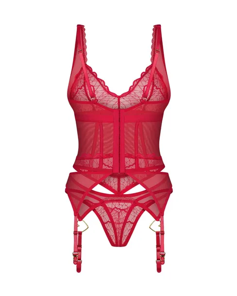 Dwuczęściowy komplet czerwonej bielizny – gorset oraz klasyczne stringi. Elastyczny materiał zapewnia doskonałe dopasowanie do sylwetki. Oryginalny design urozmaicają koronkowe wstawki i łączniki w kształcie serca. Bielizna posiada regulację pasków do pończoch i ramiączek oraz kilkustopniowe zapięcie na plecach.