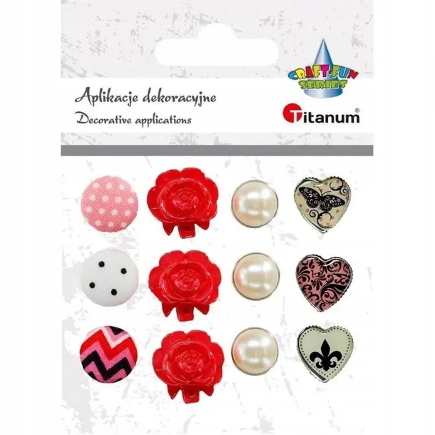 ✔️ Ćwieki 12szt. 4 wzory x 3 szt.: okrągłe z materiału 14mm, róże 17mm, perła w metalu 13mm, serce 15x15mm