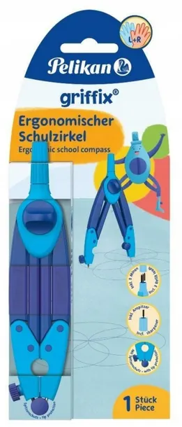 Cyrkiel Griffix to niezastąpiony element wyposażenia dla każdego, kto potrzebuje precyzyjnie i dokładnie odmierzyć odległości czy średnice w pracy biurowej czy szkolnej. Wersja niebieska sprawia, że produkt jest nie tylko funkcjonalny, ale również stylowy i elegancki. Cyrkiel Griffix został zaprojektowany z myślą o ergonomii i komforcie użytkowania. Posiada stabilną, trójkątną obudowę z wytrzymałego tworzywa sztucznego, która umożliwia pewny chwyt i precyzyjne ustawienie narzędzia. Dzięki specjalnym wycięciom w obudowie, cyrkiel nie przesuwa się po powierzchni, co zapewnia dokładność pomiarów. Cyrkiel Griffix jest łatwy w obsłudze i wygodny w użytkowaniu. Posiada regulowaną długość ramion, dzięki czemu można precyzyjnie dostosować jego rozmiar do potrzeb użytkownika. Ostrze narzędzia jest wykonane z twardej stali, co gwarantuje długotrwałe użytkowanie bez utraty właściwości tnących. Cechy główne Kształt bez kantów i ostrych końców, dlatego jest odpowiedni dla dzieci i początkujących Mały, kompaktowy, o długości 150 mm i dzieki temu idealny do przenoszenia w piórniku Zabezpieczona końcówka na czas transportu, dzięki temu nie ulegnie złamaniu Unikalna mozliwość ostrzenia grafitu w uchwycie, dzięki temu nie musisz mieć ze sobą temperówki Dziecinnie prosta regulacja dzięki dużej śrubie regulującej, dzięki temu cyrkiel jest stabilnyCechy dodatkowe Antypoślizgowa powierzchnia Mały, kompaktowy, o długości 150 mm - idealny do przenoszenia w piórniku Zintegrowany pojemnik z wkładami zapasowymi (3 wkłady, wytrzymałosć H) w uchwycie Możliwość ostrzenia grafitu w uchwycie
