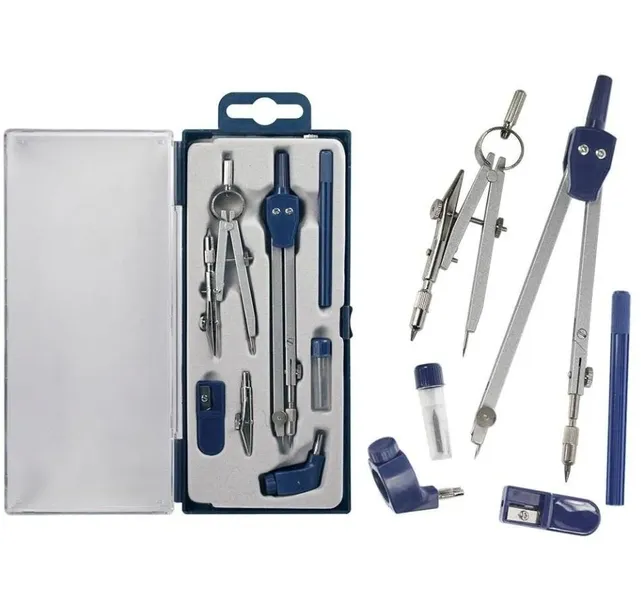 Cyrkiel metalowy 7-elementowy w zestawie: dwa cyrkle składany z łamanym ramieniem oraz precyzyjny z końcówką do tuszu, końcówka do kreślenia tuszem z obsadką, temperówka, końcówka do rapitografów, zapasowy grafit