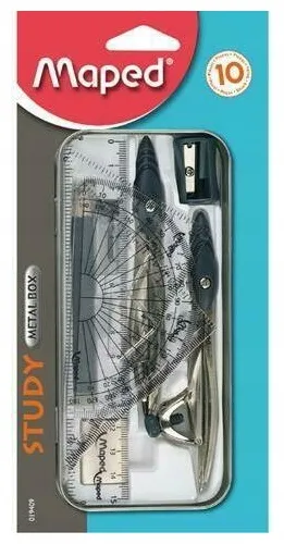 Zestaw geometryczny STUDY 10 - elementowy w metalowym pudełku zawierający: cyrkiel STUDY na grafity, cyrkiel STUDY z uniwersalnym uchwytem, linijkę, 2 ekierki, kątomierz, gumkę, ołówek, grafity i temperówkę. Blister.