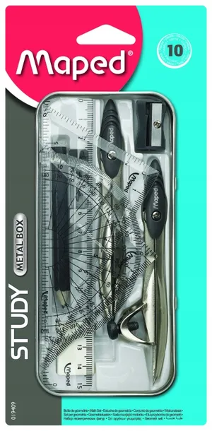 Zestaw geometryczny STUDY 10 - elementowy w metalowym pudełku zawierający: cyrkiel STUDY na grafity, cyrkiel STUDY z uniwersalnym uchwytem, linijkę, 2 ekierki, kątomierz, gumkę, ołówek, grafity i temperówkę. Blister.