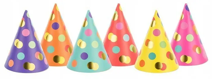 Czapeczki w 6 kolorach z kolorowymi i złotymi kropkami, wysokość ok. 16 cm, średnica ok. 11 cm.(1 op. /