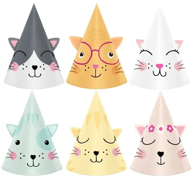 CZAPECZKI URODZINOWE KOTKI czapki na głowę imprezowe KOTEK KOT gadżety 6szt
