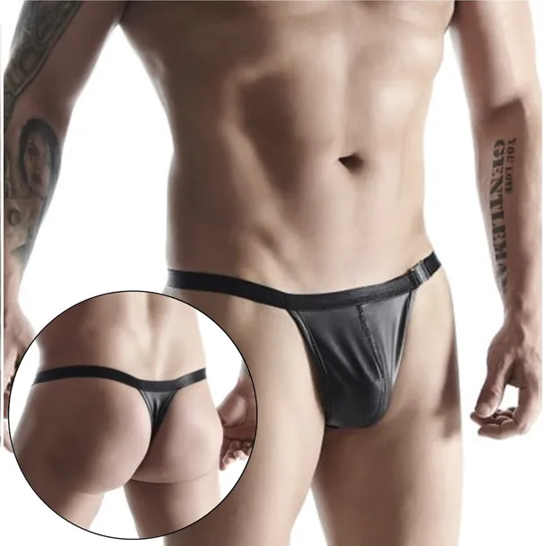 Czarne rozpinane męskie stringi zostały wykonane został z delikatnie połyskującego materiału(wetlook) oraz mocnej miłej w dotyku gumki. Zapinane na klamerkę umieszczoną z boku na biodrze pozwala na wykonanie gorącego striptizu ze spektakularnym finałem