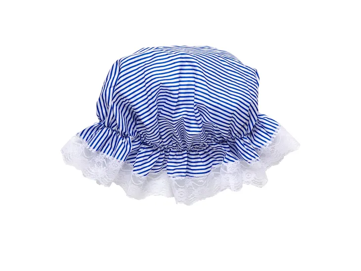 Czepek w biało-niebieskie paski ozdobiony koronką. Odpowiedni do stroju babci.Rozmiar uniwersalny. Nadaje się dla osoby dorosłej.Skład: 100% poliester.Opakowanie: 1 szt.