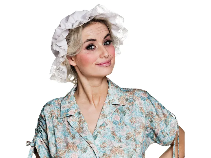 Biały czepek ozdobiony koronką. Odpowiedni do stroju babci.Rozmiar uniwersalny. Nadaje się dla osoby dorosłej.Skład: poliester 80%, bawełna 20%.Opakowanie: 1 szt.
